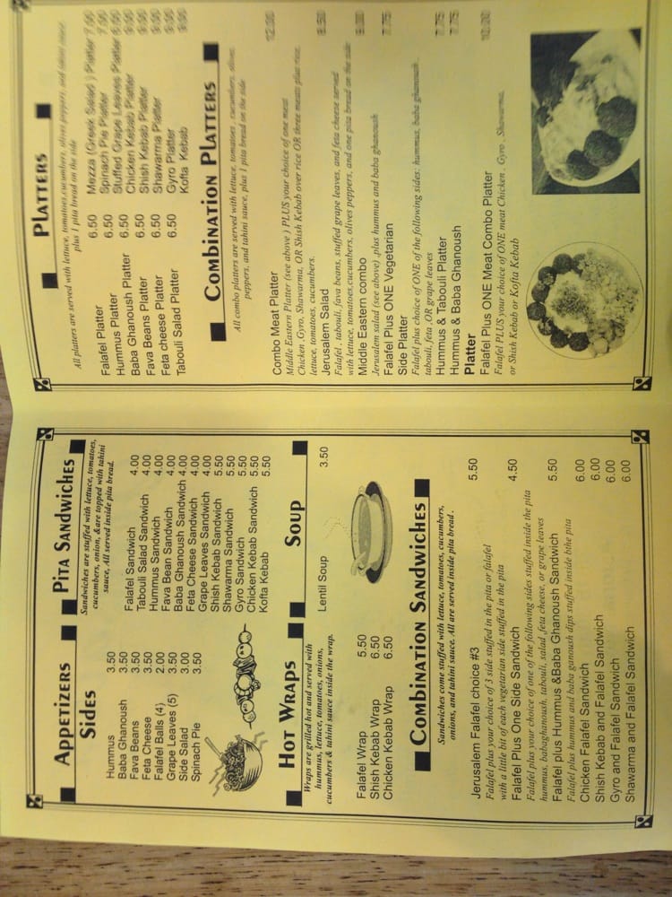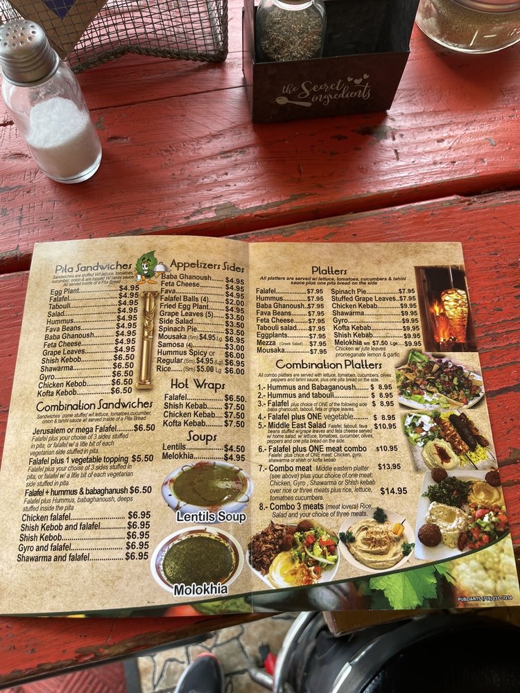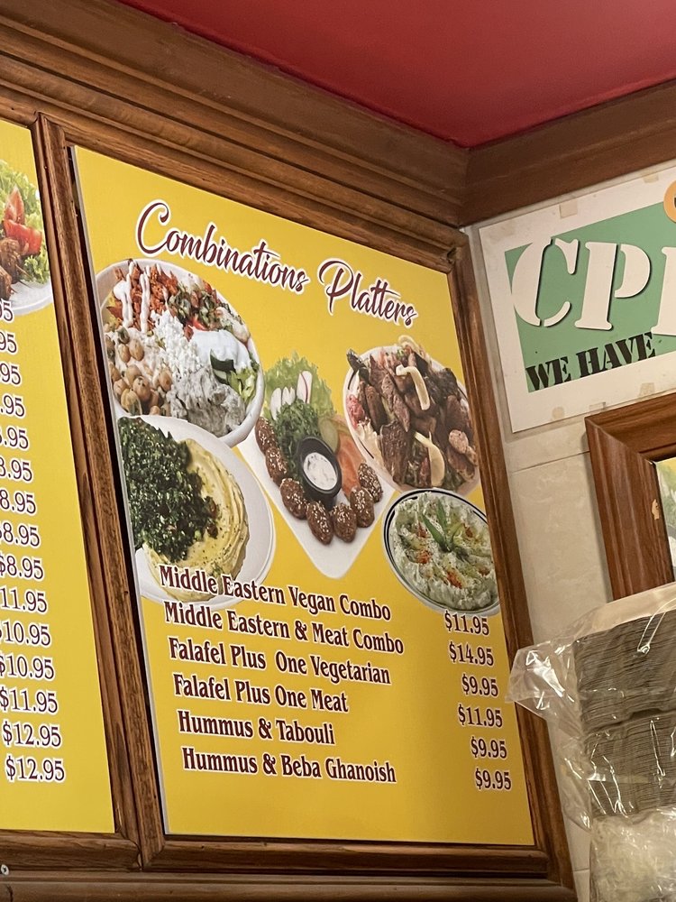Falafel, tabouli, fava beans, olives, and peppers. Served over salad, plus one sauce. Comes with one pita on the side.